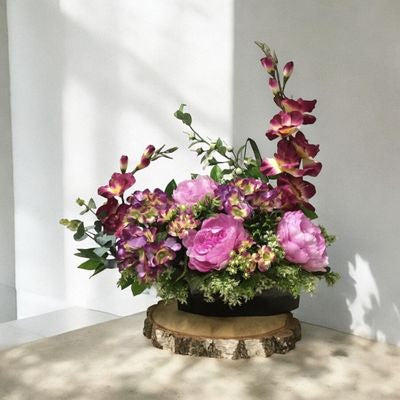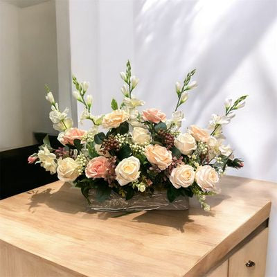 Este arreglo floral destaca por su durabilidad, ya que está compuesto por materiales resistentes que aguantan muy bien en exterior y no se decoloran fácilmente. Recomendamos encargarlo con tiempo de antelación, ya que su preparación es laboriosa y detallada. Una vez realizado el pedido, el plazo de entrega mínimo es de dos días, ya que se elaboran a demanda del cliente. ¡Decora tu hogar o jardín con este hermoso nicho de jardinera y disfruta de la belleza de las flores por mucho tiempo!