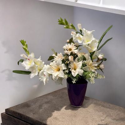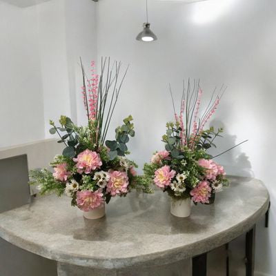 El Panteón: búcaro para pie es un hermoso arreglo floral elaborado con flores artificiales de alta calidad que imitan a la perfección a una flor natural.